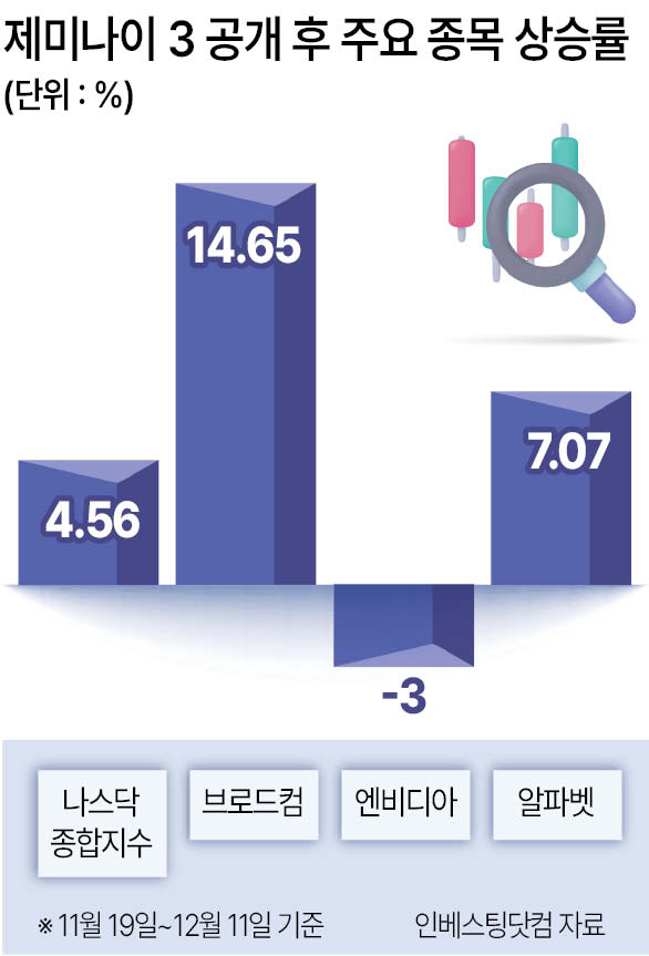 브로드컴 주가는 구글의 제미나이 3.0 공개 이후 상승 폭을 빠르게 키웠다. 지난달 19일부터 이날까지 브로드컴은 14.65% 올랐다. 같은 기간 알파벳은 7.07%, 나스닥 종합지수는 4.56% 올랐다. 그래픽처리장치(GPU) 대항마인 엔비디아가 3% 하락한 것과 대비할 때 더 강세가 부각된다.
