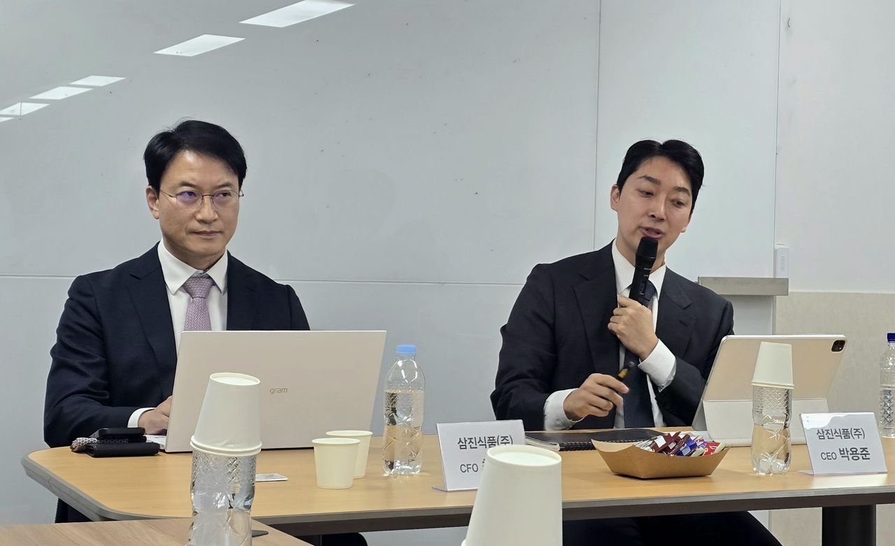 | 박용준 삼진식품 대표(오른쪽)가 11일 부산 본사에서 IPO 간담회에서 앞으로 사업 방향에 대해 설명하고 있다. 부산=이주현 기자 |
