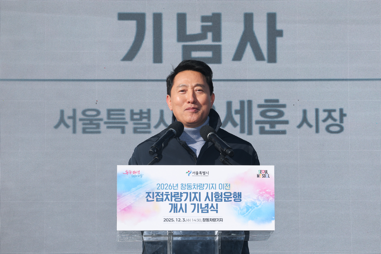 | 오세훈 서울시장이 지난 3일 서울 노원구 서울교통공사 창동차량기지에서 열린 진접차량기지 시험운행 개시 기념행사에서 기념사를 하고 있다. [연합] |