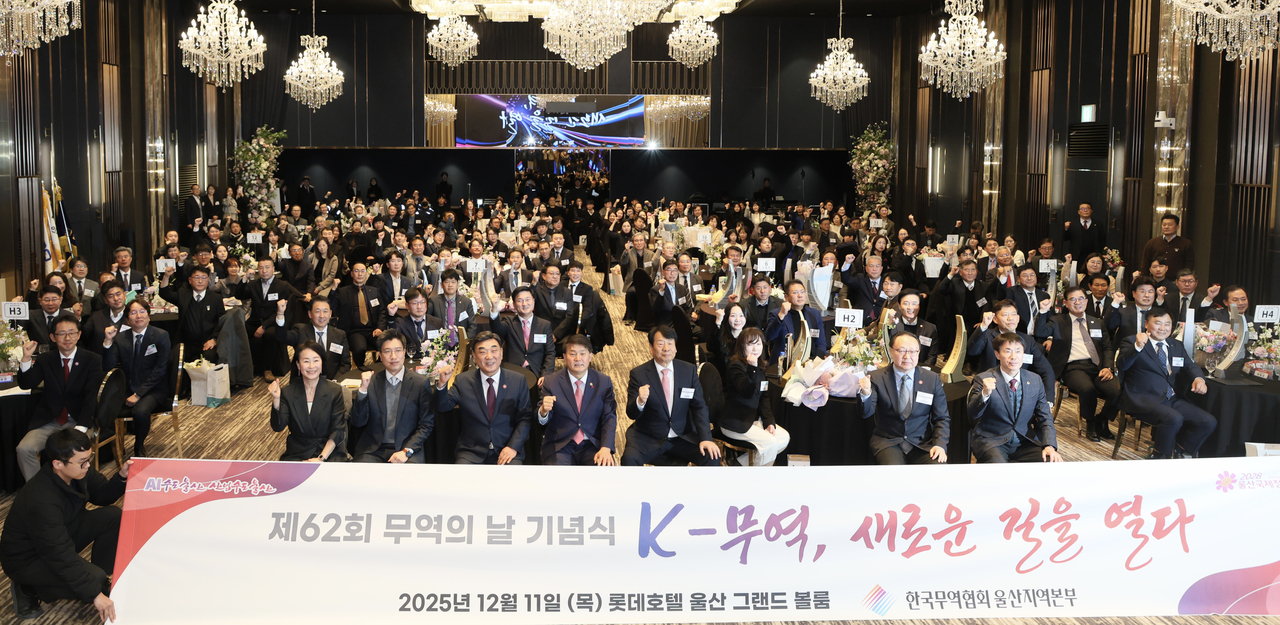 | 한국무역협회(KITA) 울산지역본부가 11일 울산 롯데호텔 그랜드볼룸홀에서 김두겸 울산시장과 수출지원 유관기관장, 수출 유공자 등 200여 명이 참석한 ‘K-무역, 새로운 길을 열다’를 주제로 제62회 무역의 날 기념식을 가졌다. [울산시 제공] |