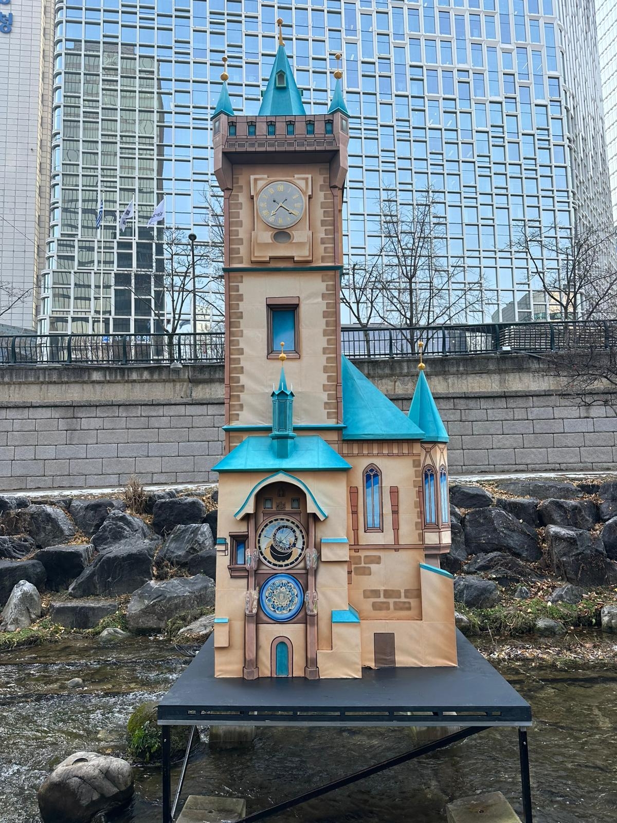 | 청계천에 개울 안에 우뚝 선 프라하 구시청사 탑과 천문시계 |