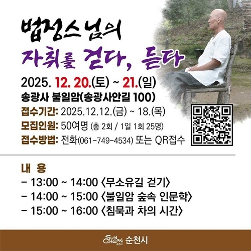 이번 프로그램은 법정스님의 수행 터전이었던 불일암에서 진행되는 시민 참여형 인문 프로그램으로, 총 2회(회당 25명) 운영하며 총 50여 명이 참여할 수 있다.