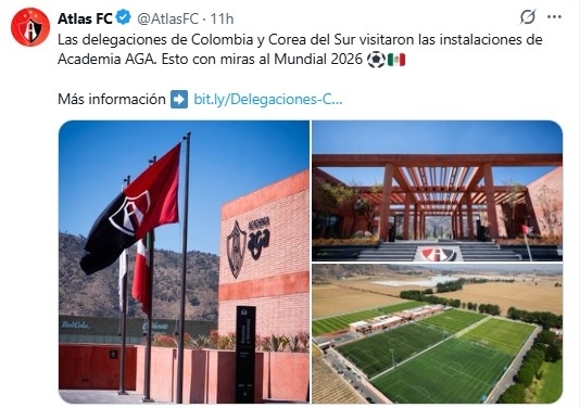 멕시코 프로축구 리가 MX 소속팀 아틀라스 FC는 14일(한국시간) 구단 홈페이지에 북중미 월드컵 베이스캠프를 찾고 있는 한국과 콜롬비아 대표팀 관계자들이 최근 구단 훈련 시설(AGA 아카데미)을 방문했다고 밝혔다. 아틀라스 FC는 과달라하라를 연고지로 둔 구단이다.