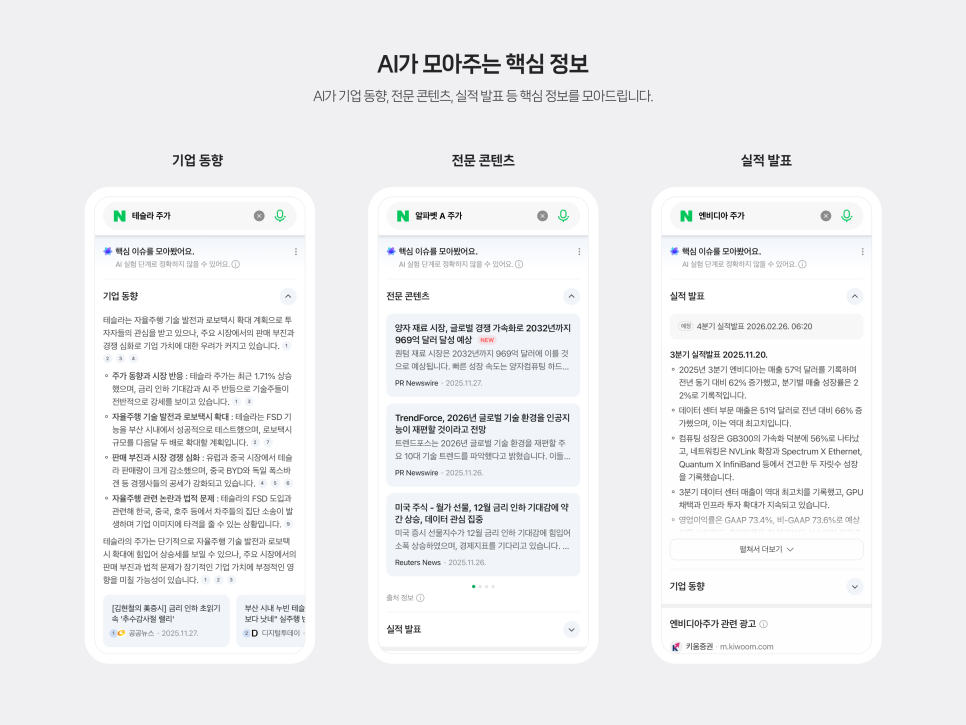 단숨에 이용자 ‘3000만명’을 모은 네이버의 통합 검색 신기능 ‘AI 브리핑’이 지난 11월부터 본격적으로 확대되고 있다. 네이버가 엔터테인먼트, 증권 등 다양한 검색 분야에 AI 브리핑을 잇달아 도입하면서다.
