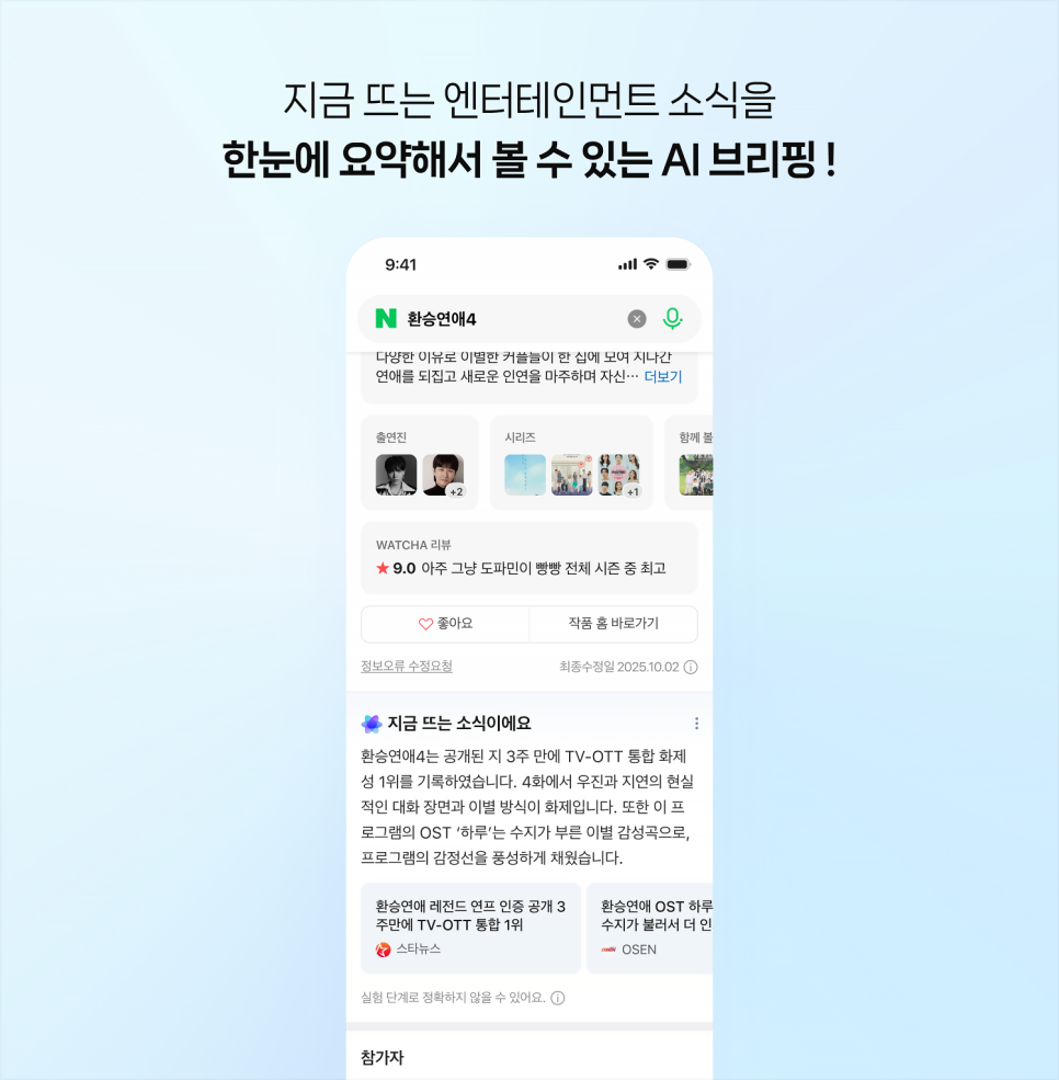 먼저 네이버는 이날 ‘스마트엔터 AI 브리핑’을 출시했다. 이는 드라마, 예능 등 엔터테인먼트 관련 작품을 검색했을 시, 화제가 되는 내용을 한곳에 모아 요약해 주는 AI 브리핑 기능이다. 해당 기능은 지난 11월 무작위 실험(A/B 테스트)을 진행한 후, 이날 정식으로 출시됐다.