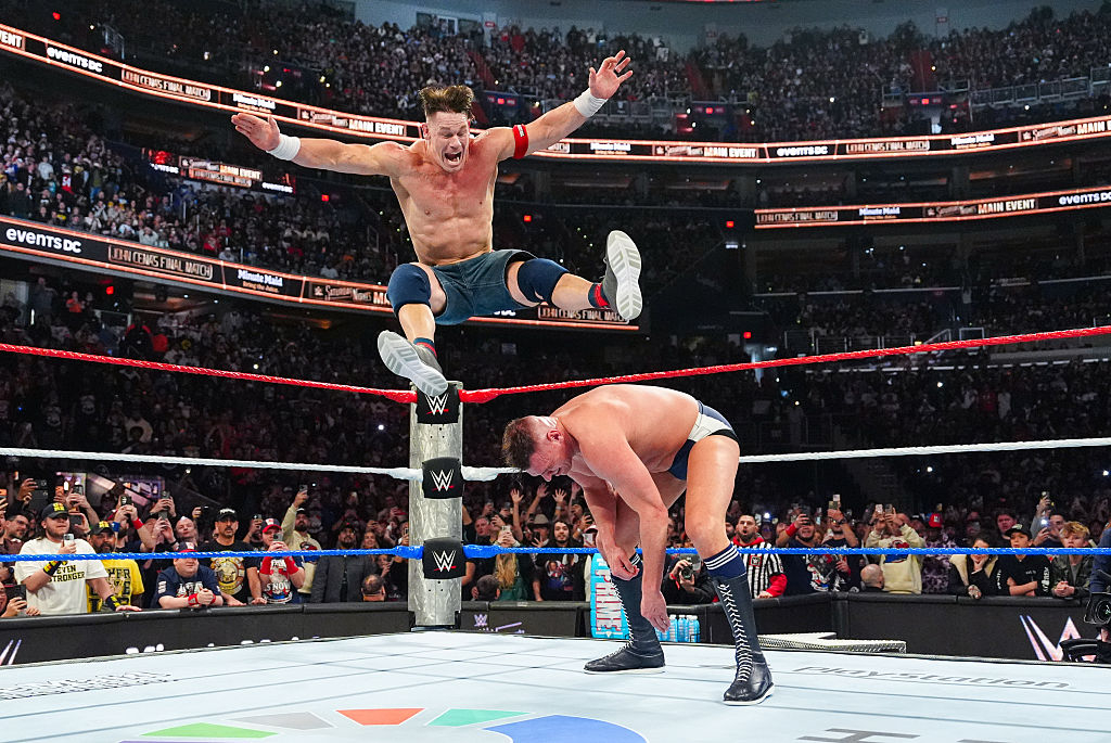 | 은퇴전에서 상대 선수 군터에게 탑로프 레그 래리엇을 시도하는 존 시나. [게티이미지] |