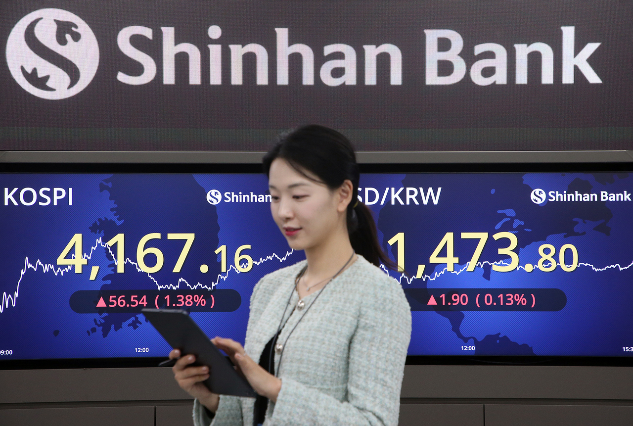 | 직전 거래일인 지난 12일 서울 중구 신한은행 딜링룸에 코스피 지수와 원달러 환율이 표시되고 있다. 이날 코스피는 전장보다 1.38% 오른 4167.16에 마감했다. [신한은행 제공] |
