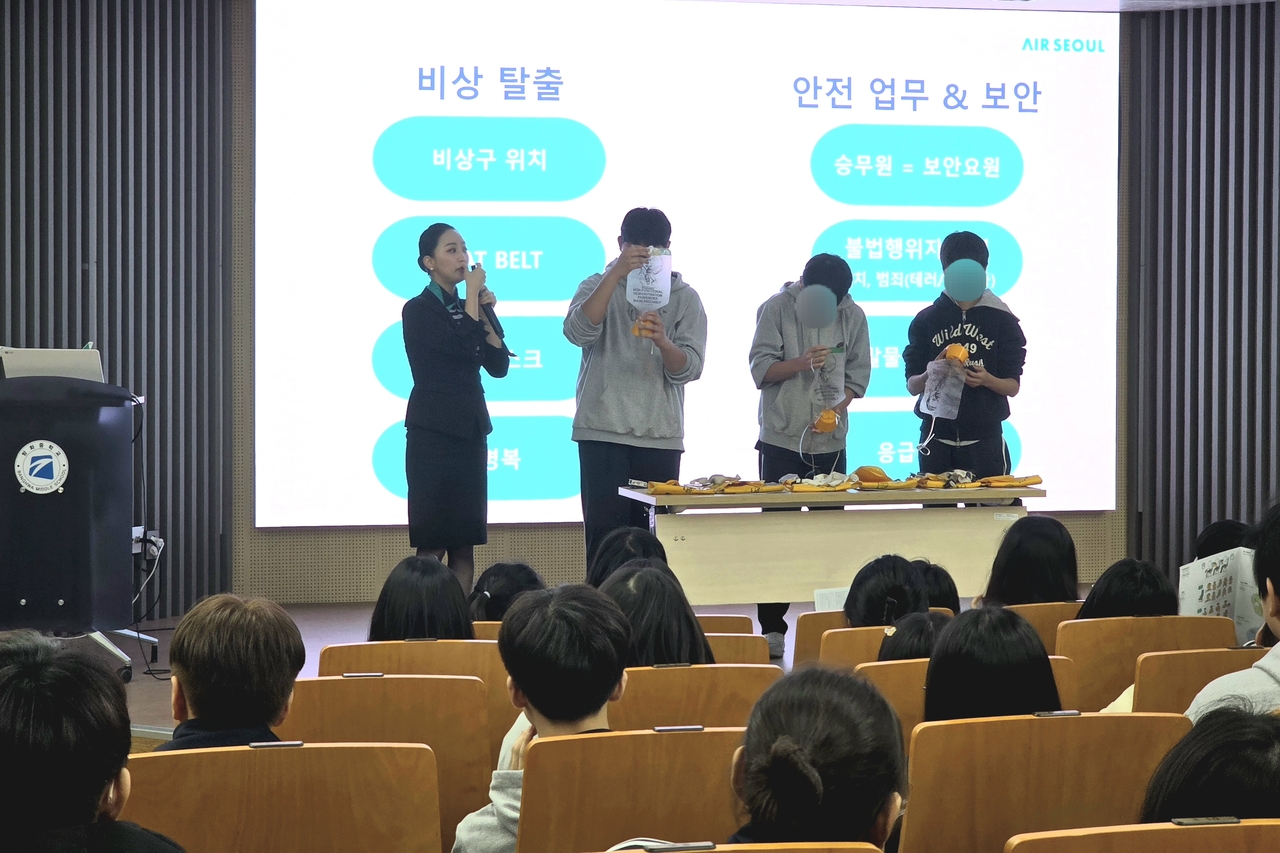 기내식 조리법에 이어 김아영 에어서울 승무원은 학생들에게 기내에서 이뤄지는 안전 업무를 소개했다. 김 승무원은 “승객들은 승무원의 서비스를 가장 많이 접하지만, 가장 중요한 업무는 승객들의 안전”이라며 “비행기에서 범죄자를 체포하는 경찰관, 불을 끄는 소방관, 환자를 치료하는 의사 모두를 담당한다”고 강조했다.