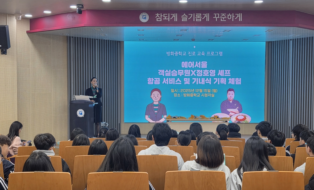 15일 일식 요리 전문가 정호영 셰프가 서울 강서구 방화중학교를 찾아 학생들과 만났다. 에어서울 기내식 개발 과정을 소개하고 학생들의 진로 탐색을 돕기 위해서다. 방화중학교 1학년인 91명의 학생들은 에어서울 승무원과 정 셰프에게 승무직과 셰프의 삶에 대한 다양한 질문을 쏟아냈다.