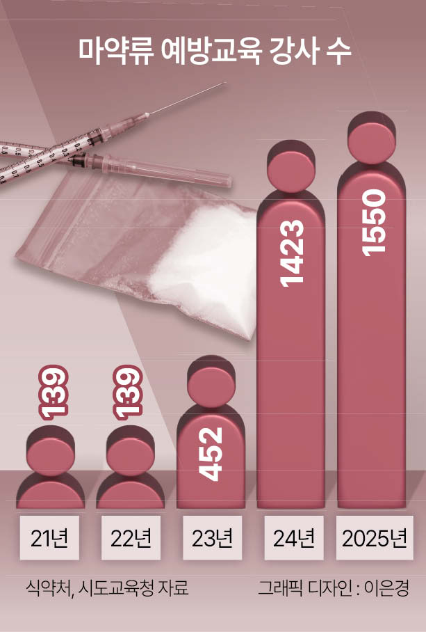 다만 정부는 마약 예방 교육 전문강사 숫자를 꾸준히 확보하면서 교육 인프라를 늘려가고 있단 입장이다. 식약처에 따르면 전국적으로 마약 예방 교육을 담당하는 마약 전문강사는 1550명이다. 마약의 위험성을 알리는 교육의 중요성이 대두된 2022년 139명에 비해 10배 이상 늘어난 수치다.