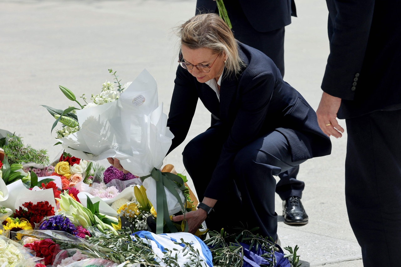 | 수잔 레이 호주 민주당 대표가 15일 시드니 본다이 해변 총격 사건 희생자들을 추모하기 위해 본다이 파빌리온에 헌화하고 있다. [AFP] |