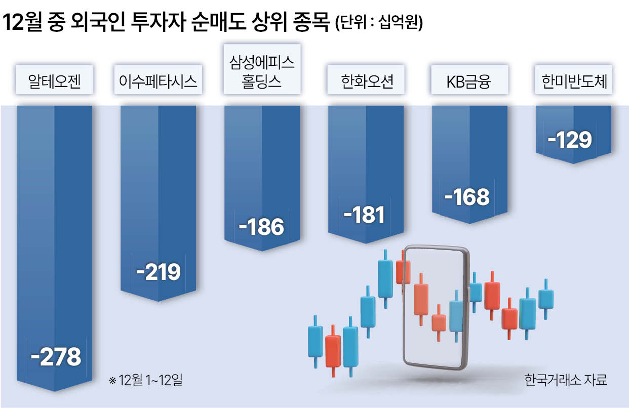 알테오젠이 12월 들어 외국인이 가장 많이 순매도한 종목인 것으로 나타났다. 3000억원 가까운 순매도를 기록, 코스닥은 물론 코스피를 포함해도 순매도 규모가 가장 컸다. 업계에선 특허 소송 관련 불확실성이 커지면서 투심이 악화되고 있다는 분석을 제기했다.