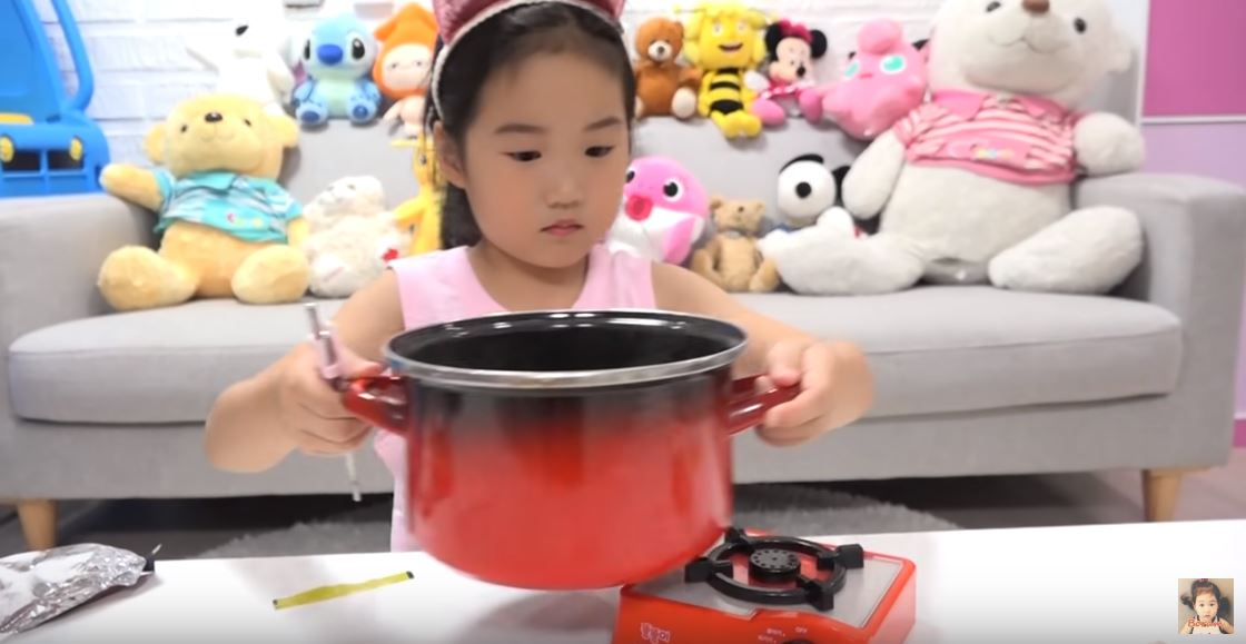 | 보람이의 아빠 삼촌 몰래 라면 끓여 먹기 주방놀이라는 제목의 유튜브 영상. [보람튜브 브이로그 갈무리] |