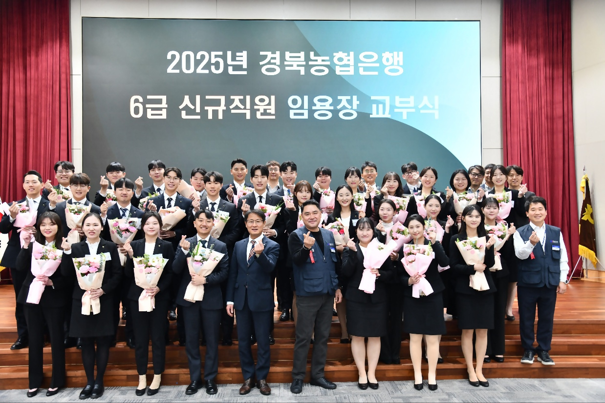 [헤럴드경제(안동)=김병진 기자]NH농협은행 경북본부는 15일 지역본부 대회의실에서 김주원 본부장, 김종필 노조위원장이 참석한 가운데 2025년 6급 신규직원 임용장 교부식을 개최했다.