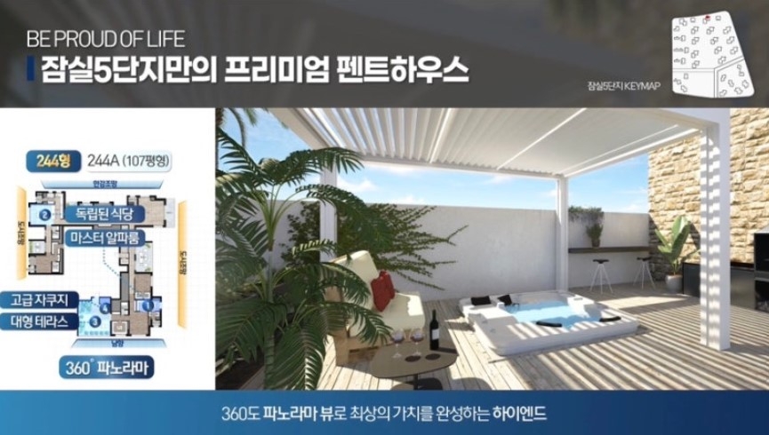 또한 244㎡ 펜트하우스를 한강, 도시 조망 모두 갖춘 360도 파노라마뷰로 만든다는 구상이다. 고급 자쿠지와 대형 테라스, 독립된 식당, 마스터 알파룸을 포함시켜 대단지 펜트하우스로서 차별화 요소를 구현하겠다는 목표다. 조합은 이러한 펜트하우스를 20여 가구 조성해 조합원을 대상으로 분양할 계획이다. 조합원 분양 이후 남는 가구는 보류지(조합이 사업비 충당 및 소송에 대비해 분양하지 않고 남겨둔 여유분)로 매각한다.