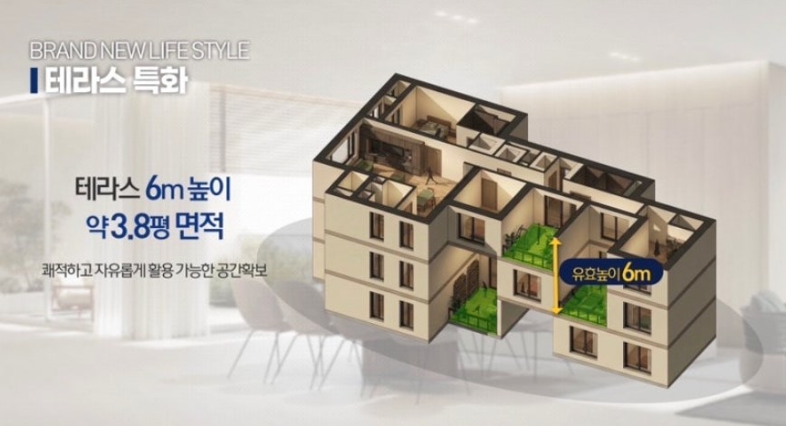 특히 전체 6411가구 중 40%가 넘는 94㎡(이하 전용면적) 이상 2703가구를 6m 높이, 약 13㎡(3.8평) 면적의 테라스를 갖춘 특화 가구로 조성할 예정이다. 조합은 테라스 특화 희망 수요를 조사 중인데 이를 반영해 추산한 가구수라는 설명이다.