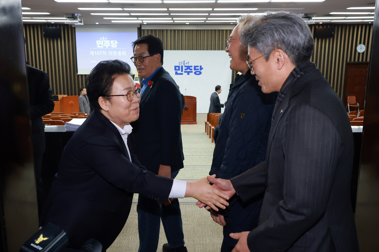 | 더불어민주당 최고위원 보궐선거 출마를 선언한 문정복 의원이 16일 국회에서 열린 의원총회에 참석하는 의원들과 인사하고 있다. [연합] |