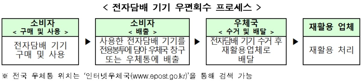 [헤럴드경제=이태형 기자] 내년 1월부터 전자담배 기기 전용 회수봉투가 제공되고 우체국 물류망을 통해 회수된다.