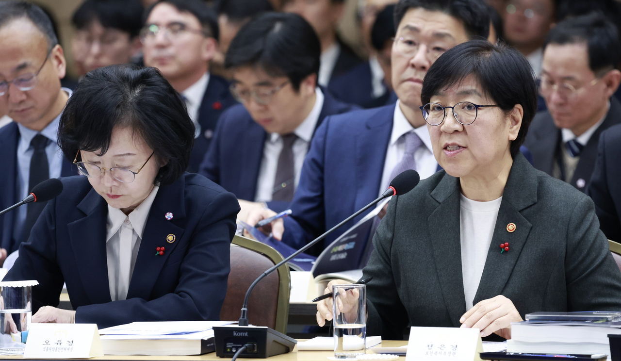 | 정은경(오른쪽) 보건복지부 장관이 16일 정부세종컨벤션센터에서 이재명 대통령에게 복지부 업무보고를 하고 있다. [연합] |