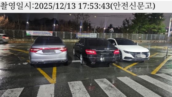 [헤럴드경제=최원혁 기자] 삼거리 교차로 한복판에 차량 3대가 불법 주차된 모습이 온라인에 공개돼 공분을 사고있다.