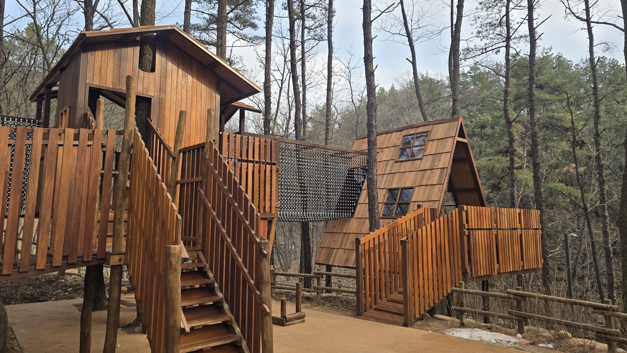 눈길을 끄는 것은 수락 휴의 인기 시설인 트리하우스에서 착안한 3동의 놀이시설이다. 너와지붕과 하늘이 보이는 천창을 도입해, 기존 트리하우스에서는 구현하기 어려웠던 ‘나무와 하나가 된 집’ 형태를 완성했다. 여러 그루의 잣나무와 굴참나무가 놀이시설을 관통하며 숲과 시설이 경계없이 어우러지는 특별한 공간감을 선사한다. 다락과 계단, 박공지붕 구조는 동화책 속 집을 연상시켜 어른들에게는 향수를, 아이들에게는 새로운 흥미를 선사할 예정이다. 각 동을 연결하는 공중 네트는 아이들의 모험심을 자극하도록 설계됐다.