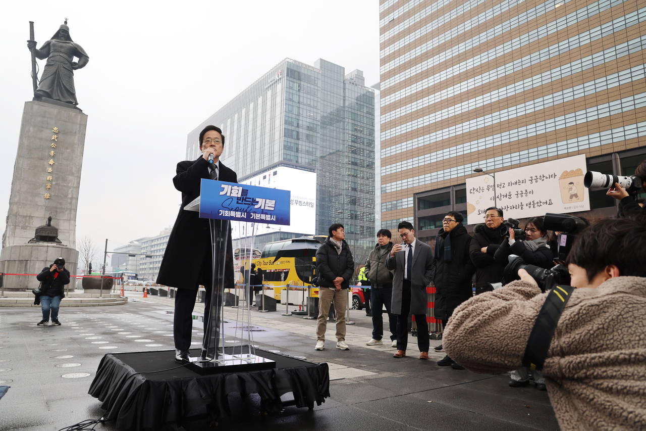 | 더불어민주당 박주민 의원이 지난 11일 서울 종로구 광화문광장에서 서울시장 출마 선언을 하고 있다. [연합] |