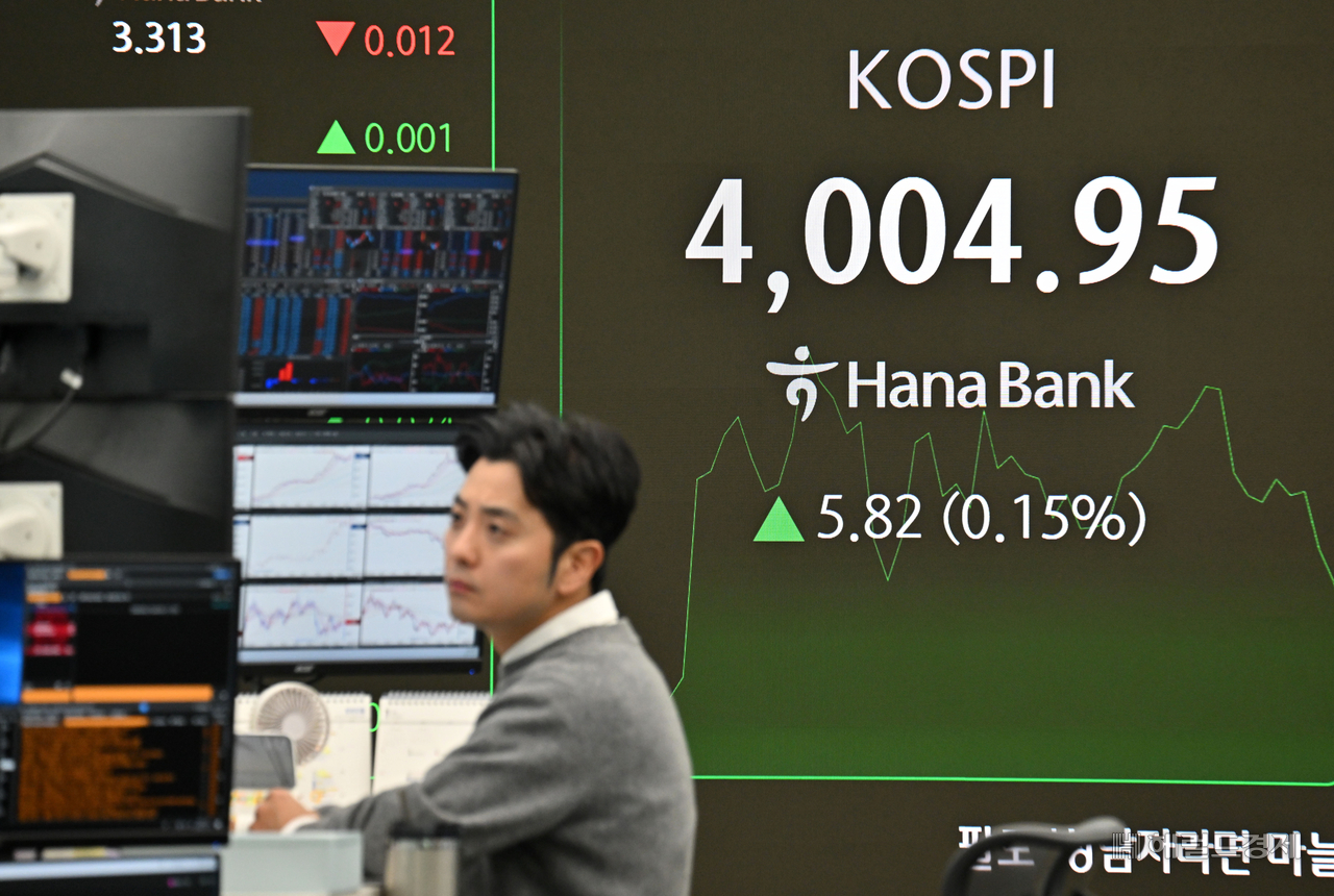 | 코스피가 17일 개인의 매수세에 힘입어 4000선을 회복하며 상승 출발했다. 이날 서울 중구 하나은행 딜링룸 전광판에 오전 9시 59분 기준 코스피 지수가 전 거래일보다 5.82포인트 상승한 4004.95포인트를 나타내고 있다. 임세준 기자 |