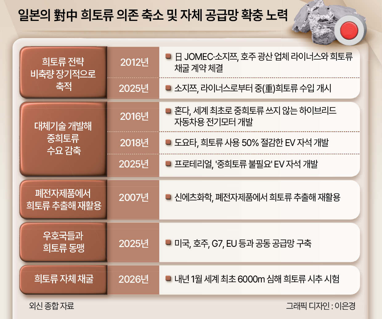 중국의 다음 카드는 ‘희토류 통제’가 될 것이라는 전망에도 다카이치 내각은 크게 동요하지 않는 분위기다. 그 이유로는 일본이 2010년 센카쿠 분쟁 이후 15년간 희토류 공급망 다변화에 나서며 희토류 ‘탈중국’을 꾀했기 때문이란 분석이 나온다.