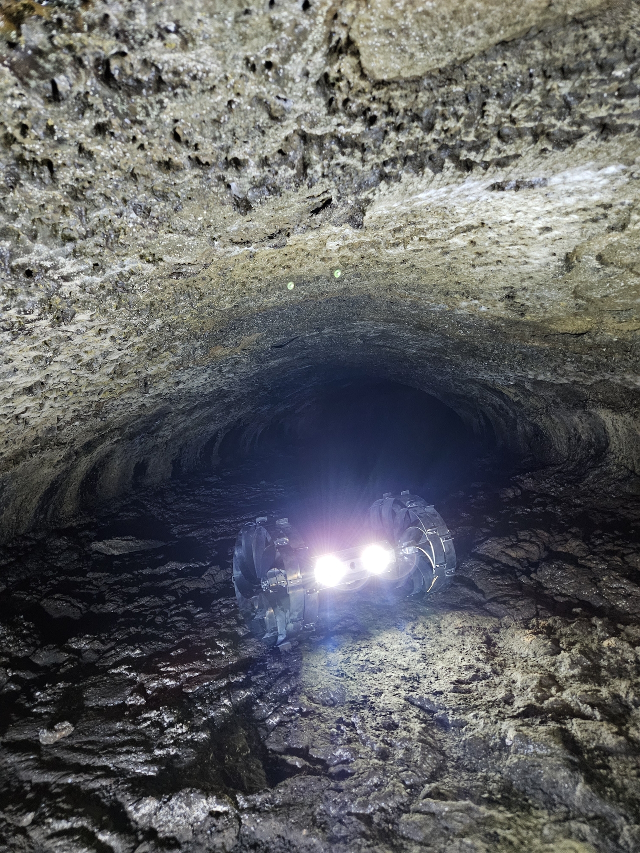 | 제주도 용암동굴을 탐사 중인 전개형 휠 달탐사 로버.[KAIST 제공] |