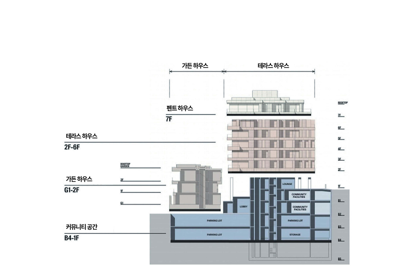 이 같은 차별화 설계 외에도 펜트하우스는 약 3.3m, 테라스하우스·가든하우스는 약 3m의 층고를 확보해 개방감을 극대화했고, 평면과 인테리어, 마감재, 조경까지 입주자 각각이 커스터마이징 가능한 방식으로 공급됐다.