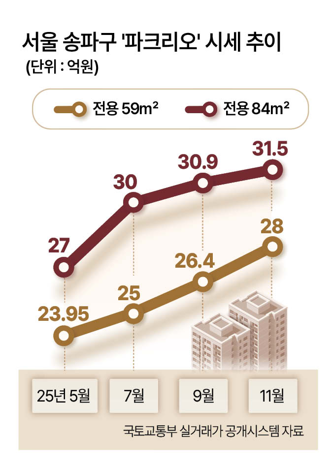 실거래가에서도 신고가 흐름이 확인된다. 국토교통부 실거래가 공개시스템에 따르면 거래량 1위 단지인 파크리오는 11월에도 신고가 거래가 이어졌다. 지난달 17일 59㎡(전용면적)가 28억원(6층)에 거래됐고, 같은 날 84㎡는 31억5000만원(16층)에 손바뀜했다.