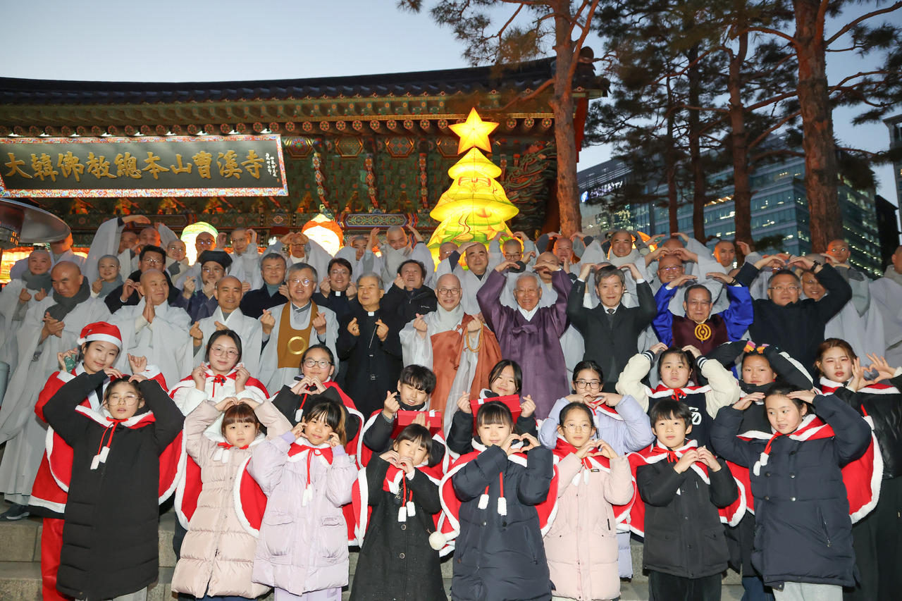 | 대한불교조계종은 18일 저녁 서울 종로구 조계사 일주문 앞에서 이웃 종교 지도자를 초청해 크리스마스 트리등 점등식을 개최했다. [대한불교조계종] |