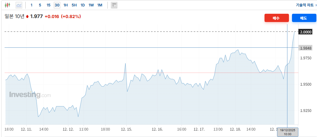 | 일본은행(BOJ)의 기준금리 인상 여파로 일본 장기 국채 금리가 19년 만에 2%대를 넘어섰다.[인베스팅닷컴] |