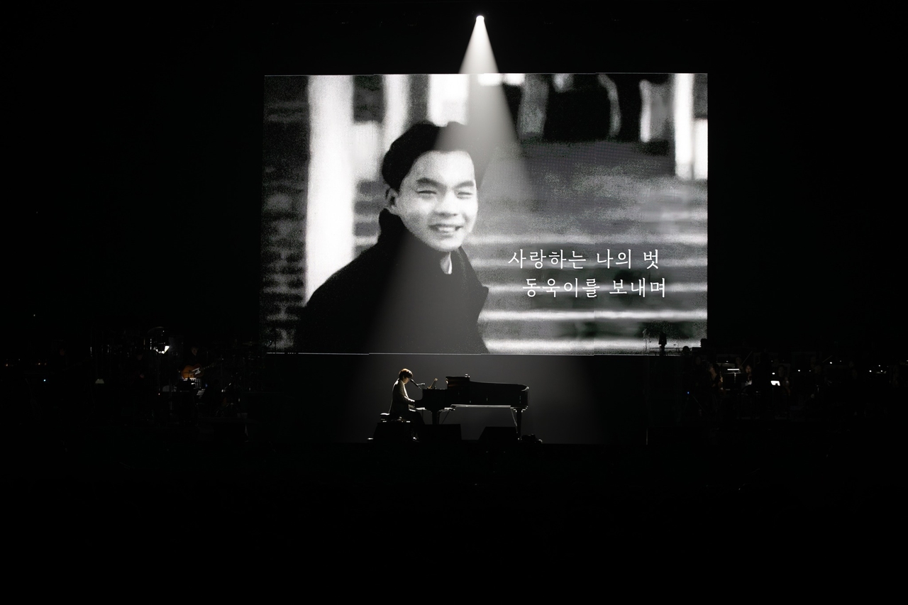 그는 최근 서울 올림픽공원 KSPO돔(체조경기장)에서 열린 단독 콘서트 ‘산책’ 막바지에 ‘사랑하는 나의 벗 동욱이를 보내며’라는 문구가 담긴 사진과 함께 ‘첫사랑’과 ‘기억의 습작’을 불렀다.