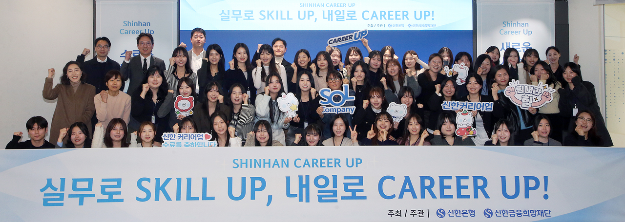 ▶현장형 프로그램으로 취업 역량 강화=신한은행은 일자리 확대와 함께 청년층의 실질적 취업역량을 높이기 위한 프로그램 운영에도 나서고 있다. 대표적으로 ‘신한 커리어업’은 신한은행 유휴 공간에 구축한 가상 오피스(SOL컴퍼니)를 6주간 출퇴근하는 방식으로 진행된다. 홍보·마케팅·UX·UI 등 직무 프로젝트와 현직자 멘토링을 결합한 실전형 교육 과정이다. 최근 3년간 약 450명이 참여했으며 작년 기준 누적 취업률은 약 80%에 달한다.