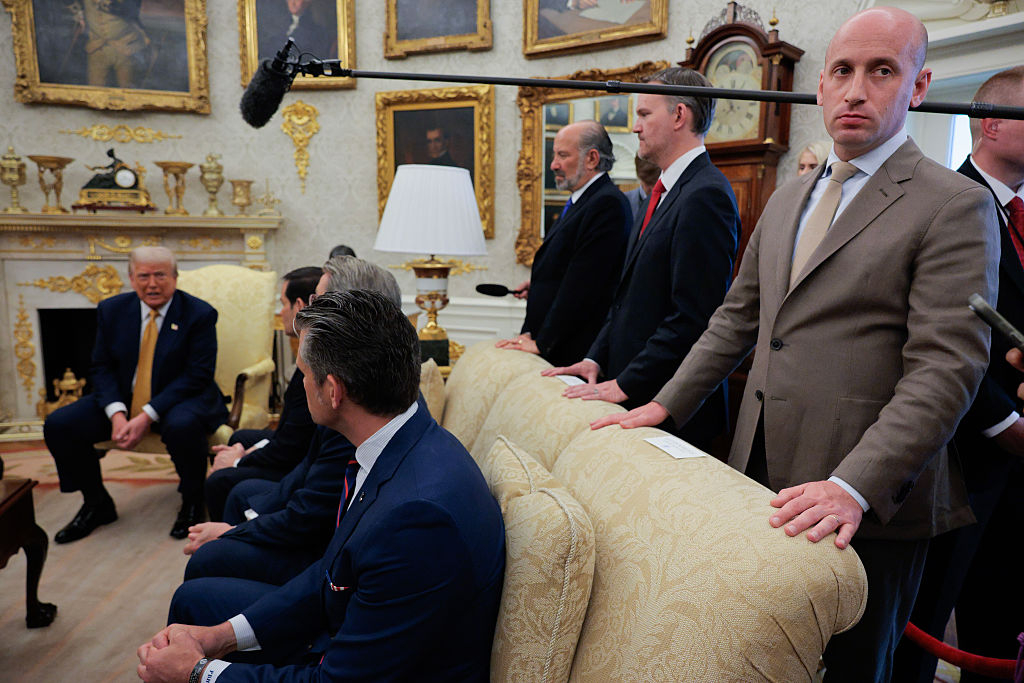 | 도널드 트럼프 미국 대통령(왼쪽)이 지난 7월 백악관 대통령 집무실에서 페르디난드 마르코스 주니어 필리핀 대통령과 회담 할 당시의 모습. 스티븐 밀러 국토안보보좌관(오른쪽)이 회담에 배석했다.[게티이미지] |