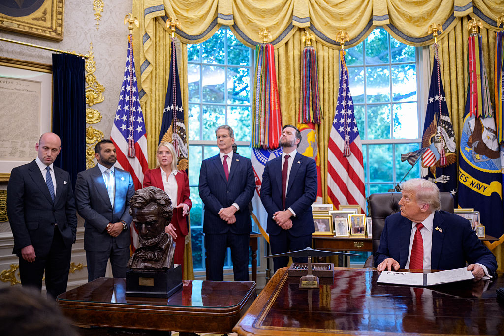 | 트럼프 미국 대통령(오른쪽)이 지난 9월 백악관 대통령 집무실에서 행정명령에 서명하며 참모진들을 돌아보고 있다. 밀러 국토안보보좌관(왼쪽부터)과 캐시 파텔 연방수사국(FBI)국장, 팸 본디 법무장관, 스콧 베선트 재무장관, JD밴스 부통령 등이 자리에 함께 했다.[게티이미지] |