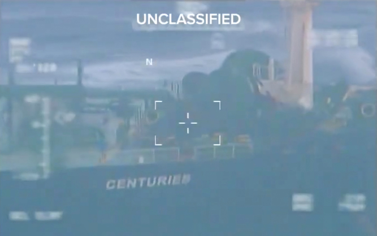 | 미국 군용 헬기가 파나마 국적 유조선 ‘센추리스(Centuries)’ 상공을 비행하고 있는 모습., [로이터] |
