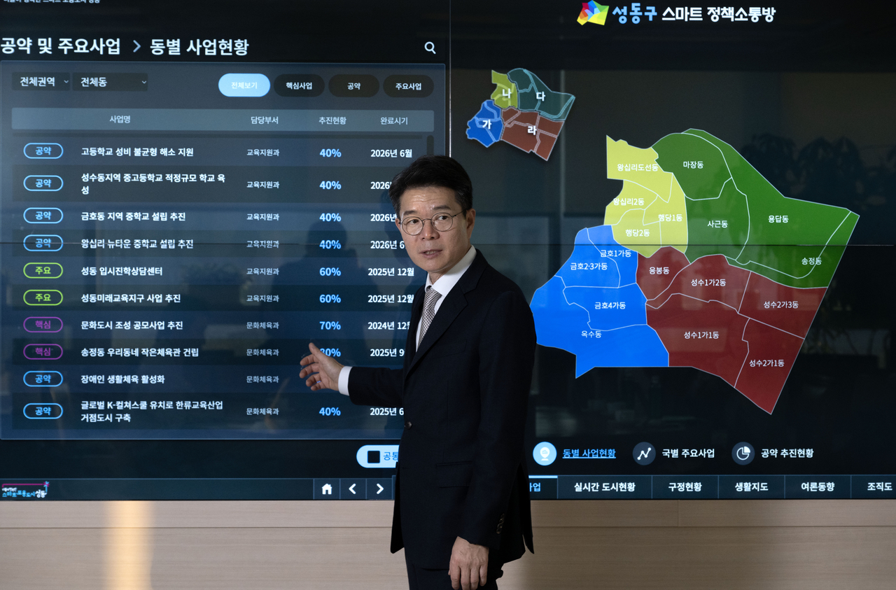 | 정원오 서울 성동구청장이 지난 17일 오후 서울 성동구청 전략회의실에서 인터뷰 도중 구정 상황판을 설명하고 있다. 임세준 기자 |