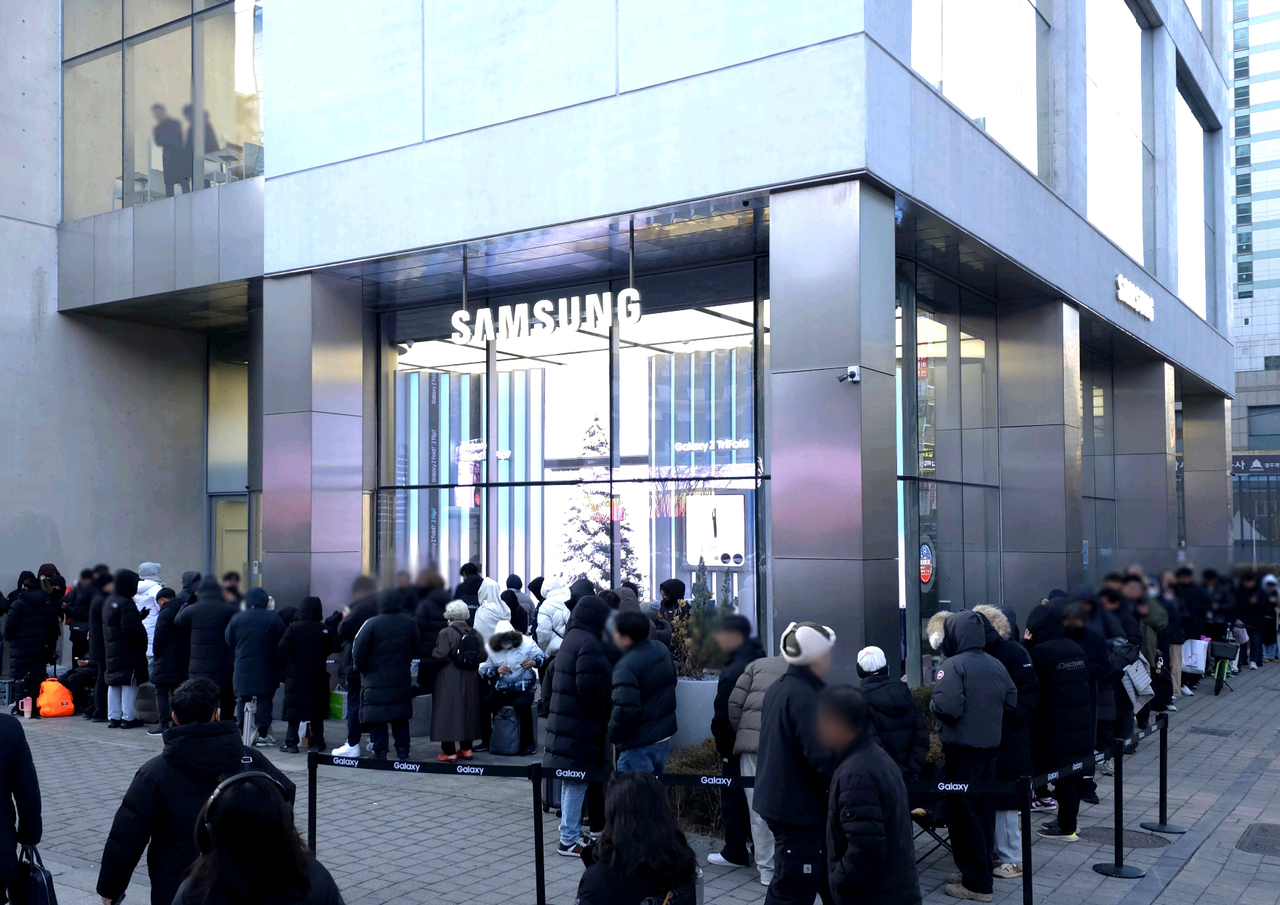 | 삼성전자의 두 번 접는 형태의 폴더블 스마트폰 ‘갤럭시 Z 트라이폴드’ 국내 판매가 시작된 지난 12일 서울 강남구 삼성 강남에서 시민들이 구매를 위해 줄을 서서 대기하고 있다. [연합] |