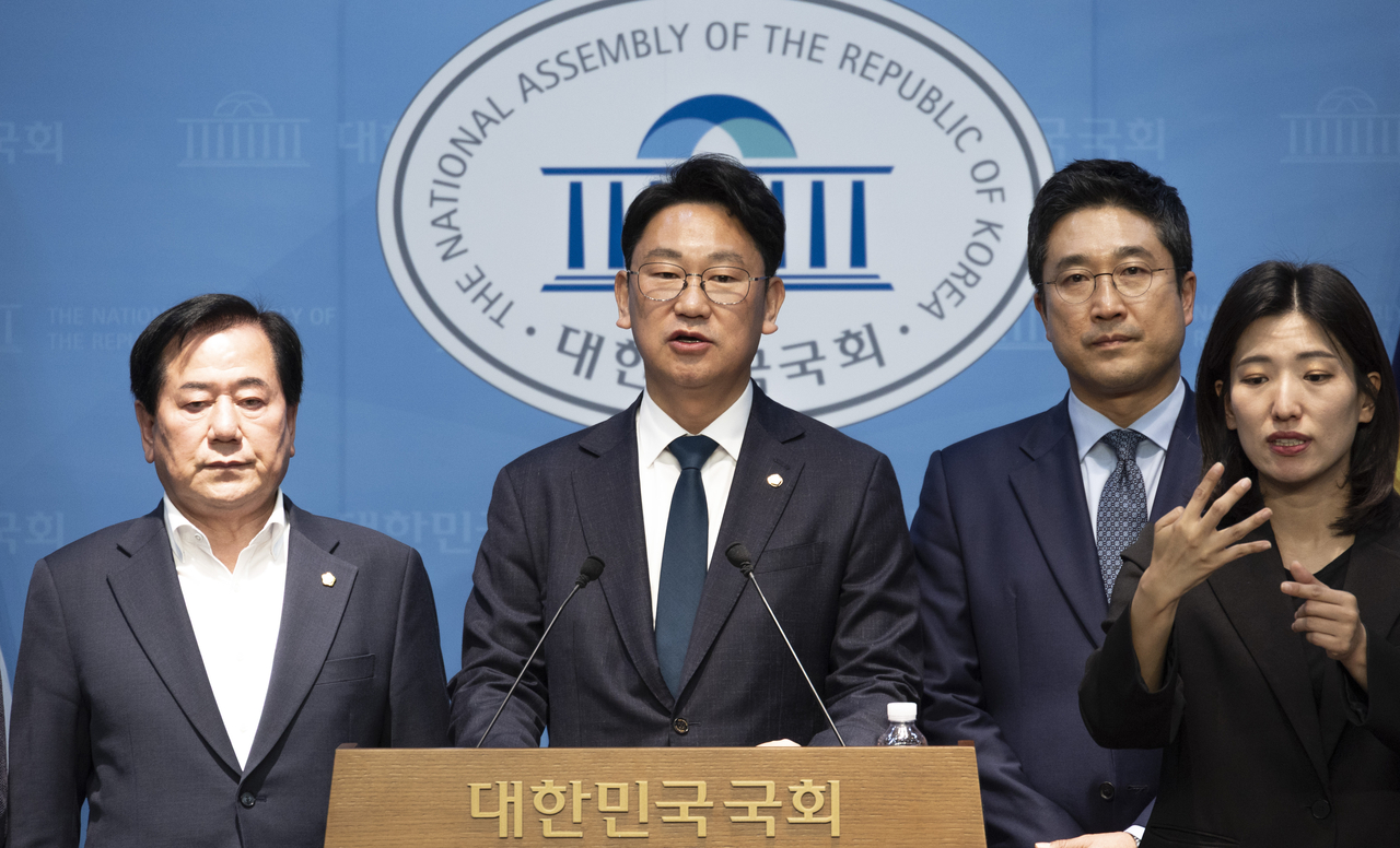 | 곽상언(왼쪽에서 두 번째) 더불어민주당 의원이 국회 소통관에서 기자회견을 하고 있다. [연합] |
