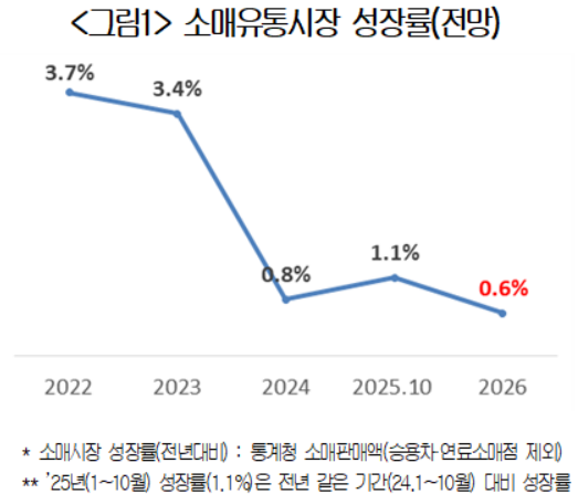 22일 대한상공회의소(이하 대한상의)가 전국 소매유통업체 300개를 대상으로 진행한 2026년 유통산업 전망조사 결과에 따르면 내년 국내 소매유통시장 성장률은 0.6%에 머물 전망이다. 이는 최근 5년간 가장 낮은 수치이다.