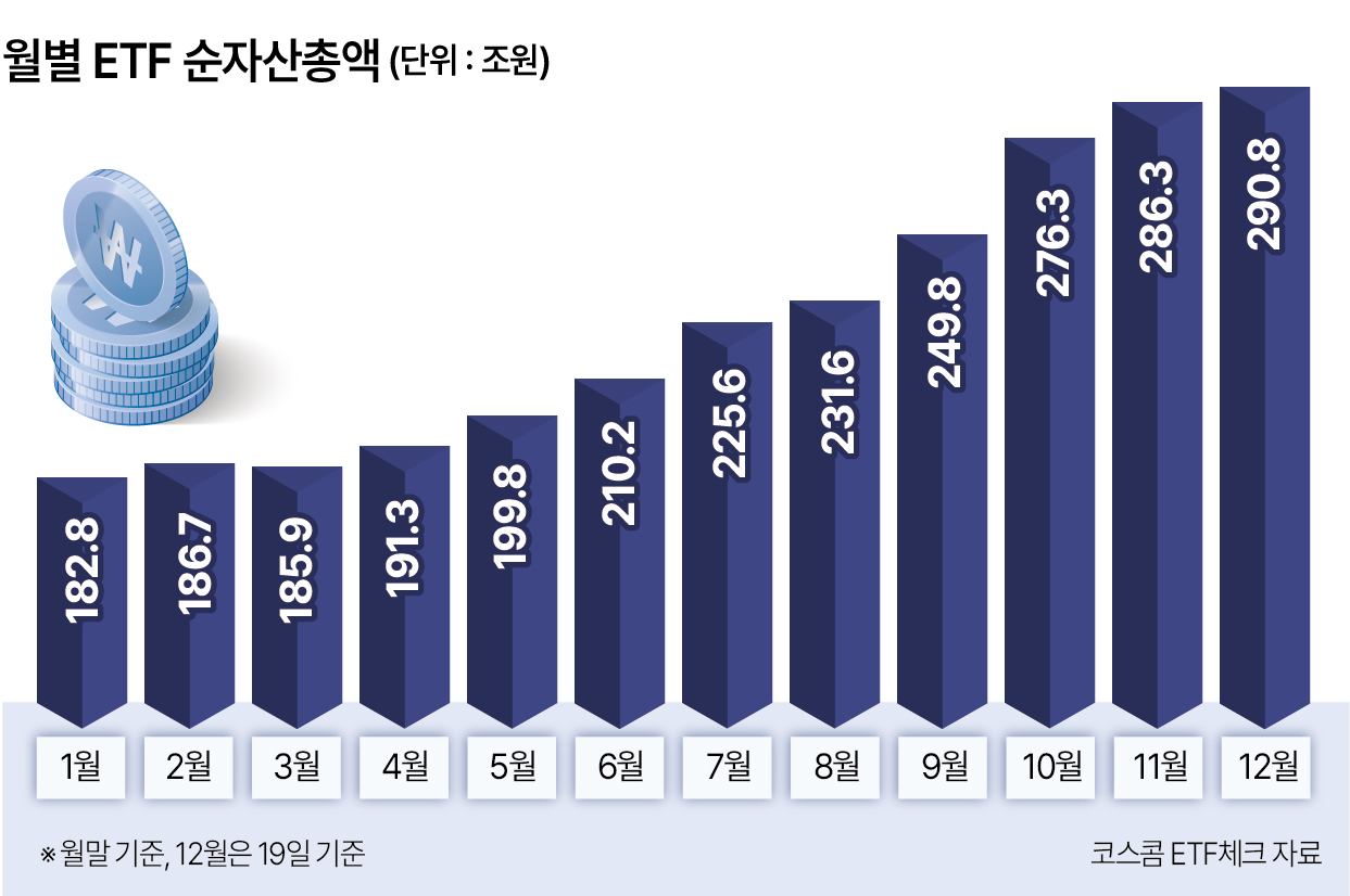 22일 한국거래소 정보데이터시스템에 따르면 지난 19일 기준 국내 상장된 ETF 순자산총액(AUM)은 290조8358억원으로 나타났다. 지난 1월말 182조원 수준이던 ETF 시장은 월 평균 9조8000억원씩 성장했다.