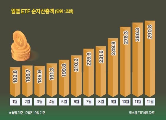 월말 기준 ETF 순자산총액은 ▷1월 182조8000억원 ▷2월 186조7000억원 ▷3월 185조9000억원 ▷4월 191조3000억원 ▷5월 199조8000억원 ▷6월 210조2000억원 ▷7월 225조6000억원 ▷8월 231조6000억원 ▷9월 249조8000억원 ▷10월 276조300억원 ▷11월 286조3000억원으로 꾸준히 증가했다. 운용업계에서는 이 같은 속도면 무난히 연내에는 300조원을 돌파할 것으로 내다보고 있다.