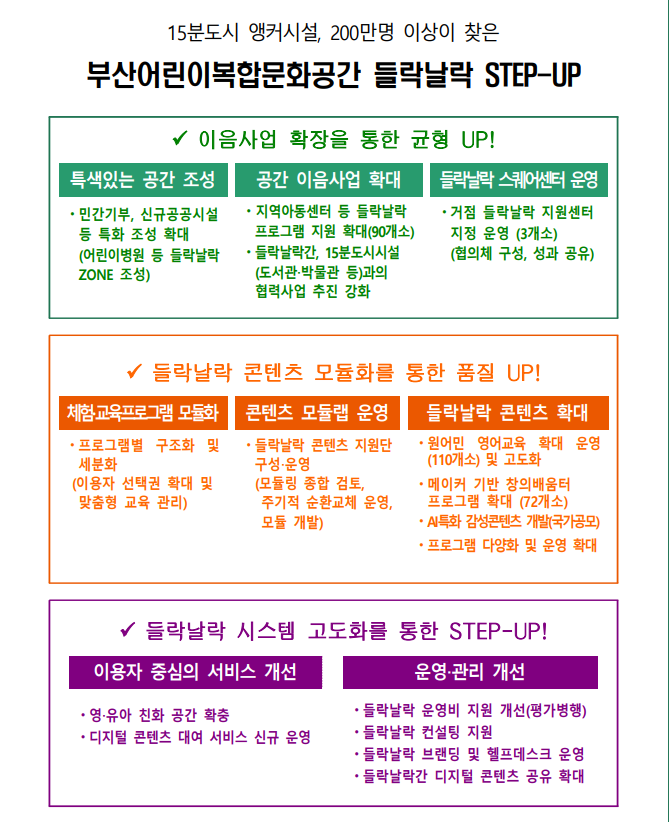 콘텐츠의 품질 업은 아이들이 마음껏 배우고 꿈꾸며 사교육비도 덜어 줄 수 있는 프로그램을 다양화하고 주제별로 구조화·세분화한다. 학부모들의 큰 호응을 얻고 있는 원어민 영어 프로그램 ‘들락날락 영어랑 놀자’는 규모를 110곳 이상으로 확대하고, 권역별 거점시설 지정하여 4세반 별도 운영, 단기특강반 확대 등 특화 프로그램을 운영한다.