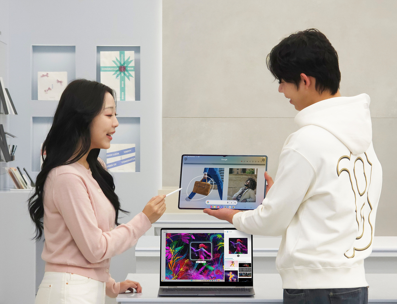 | 삼성전자 모델이 ‘갤럭시 탭 S11 울트라’의 ‘서클 투 서치’ 기능과 ‘갤럭시 북5 프로’의 ‘AI 셀렉트’ 기능을 체험하는 모습 [삼성전자 제공] |