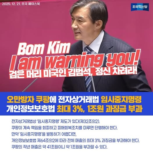 그러면서 “Bom Kim(김범석 쿠팡 창업자 겸 쿠팡InC 의장의 미국 이름), I am warning you!(경고한다). 미국인 김범석, 정신차려라”라고 김 의장을 향해 꾸짖었다.