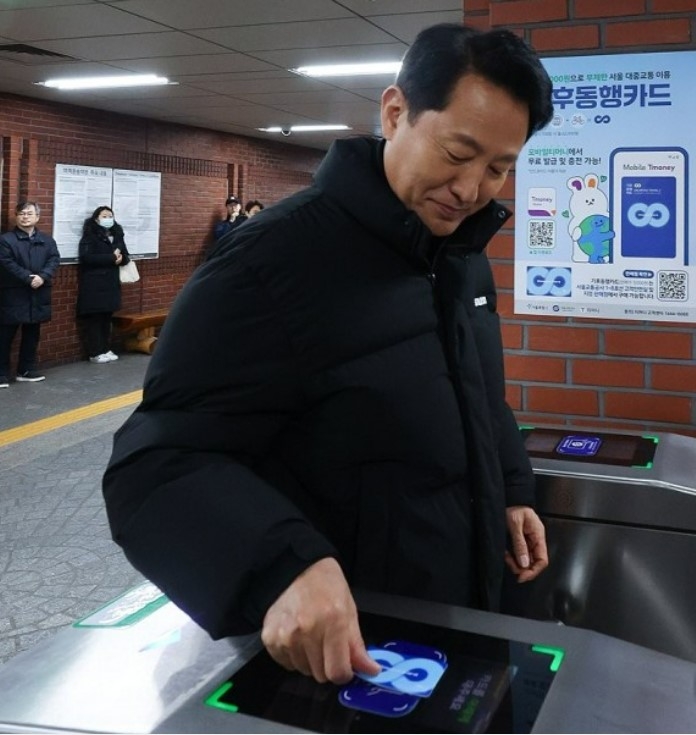 | 오세훈 서울시장이 지난해 1월 기후동행카드로 서울 지하철 시청역 개찰구를 통과하고 있다. [연합] |