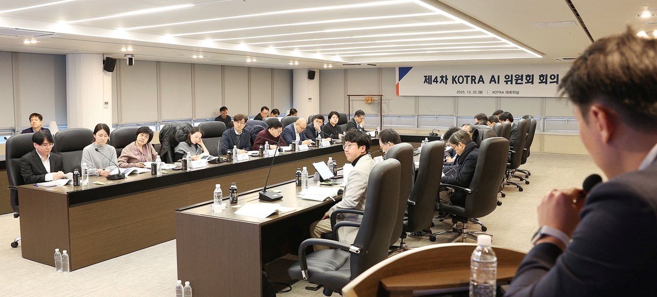 | 코트라가 22일 서울 코트라 본사에서 ‘코트라 AI 위원회’를 개최해 2025년 AI 활용·지원 결과 및 2026년 AI 활용·지원 계획을 발표했다. 22일 열린 ‘제4차 코트라 AI 위원회’의 회의 모습. [코트라 제공] |