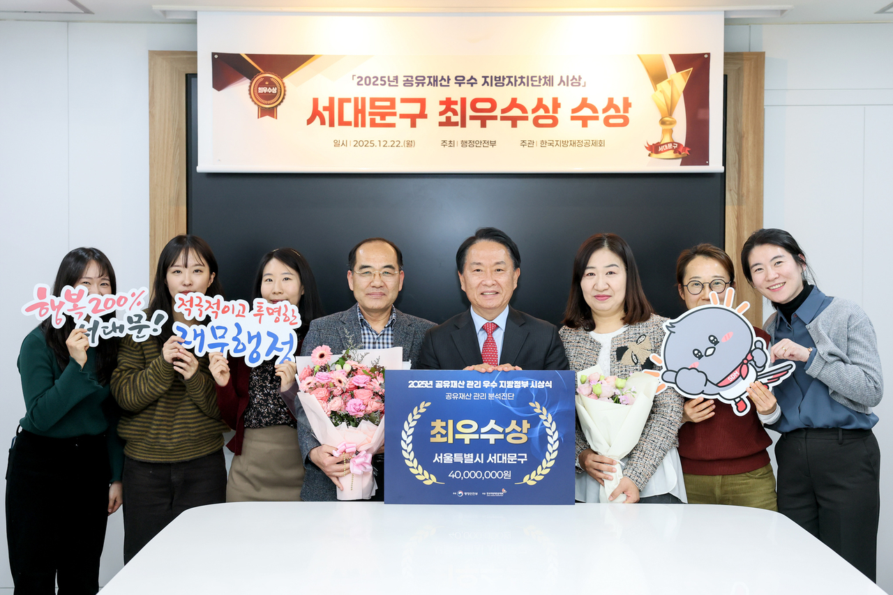 [헤럴드경제=박종일 선임기자]서대문구(구청장 이성헌)는 최근 행정안전부가 주관한 ‘2025년 공유재산 관리 우수 지방정부 시상’에서 ‘공유재산 관리·분석 진단 평가’ 부문 최우수상을 차지했다.